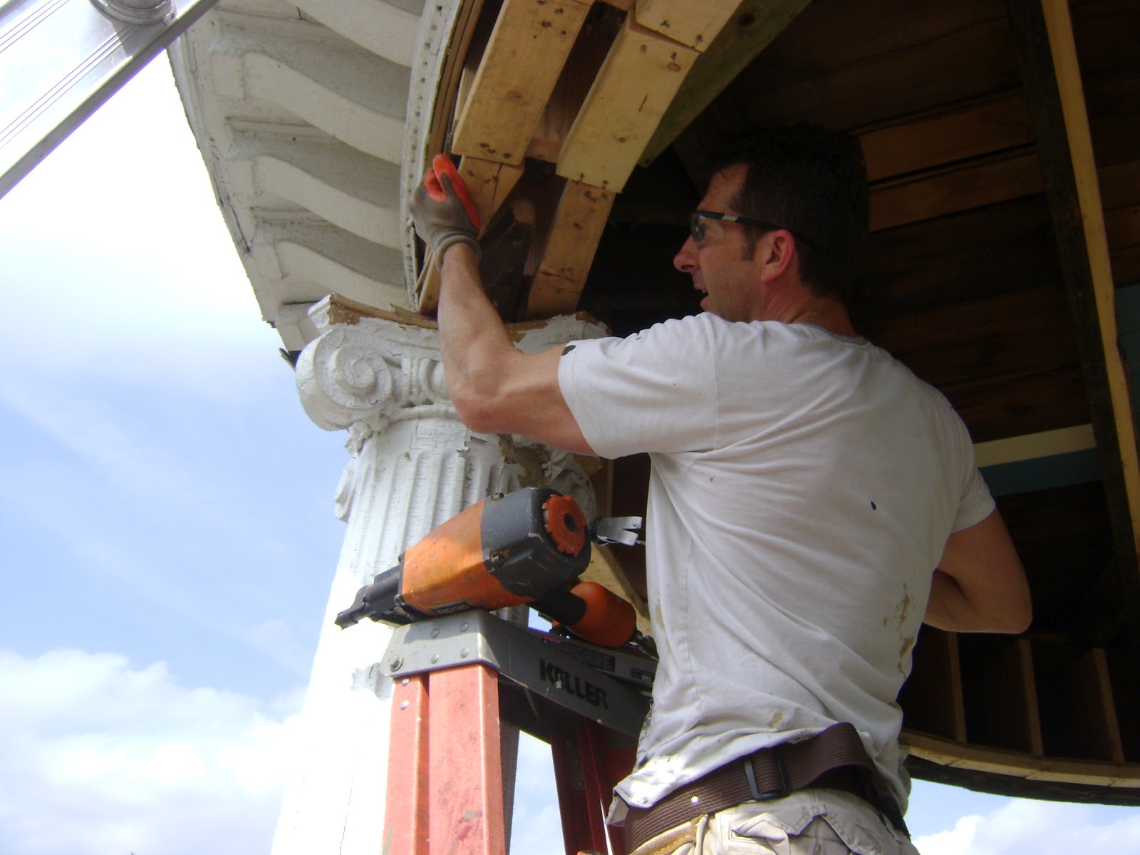 For those of you who have been driving by recently, you will see that we have been doing a lot of work on the rotunda. I had to almost completely reframe the interior of the rotunda but it is definitely stronger than what it was. I removed some of the fascia, soffit, and corbels yesterday on the rotunda...completely rotted. I am starting to wonder if I should have just torn the whole thing down and started over. Will continue to install new wood to support all of the replacement soffit and fascia.
